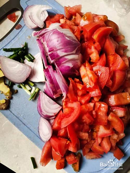 倒入油,加入洋葱和生姜,加入西红柿和洋葱,炒成汁。加盐,糖!把水倒进