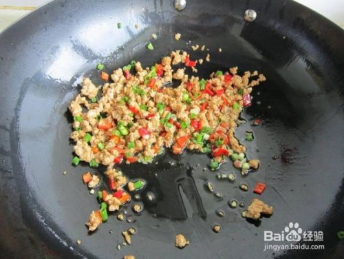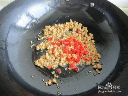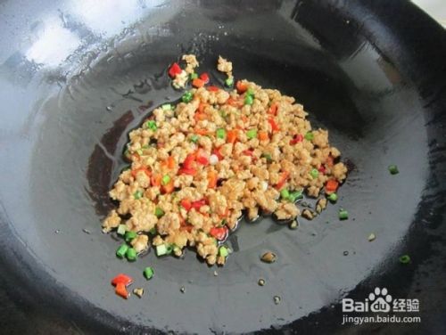 热锅凉油,油热7成下姜末翻炒出香味,下肉末翻炒出水分出香味。