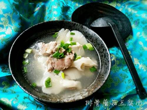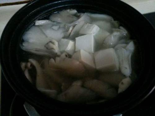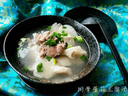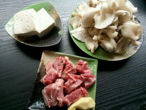 排骨焯水和姜,水入煲煲35分钟,加入蘑菇和豆腐煲多10分钟