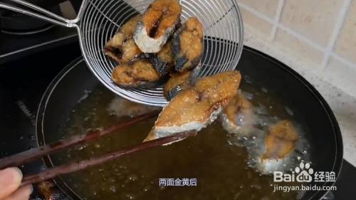 一面金黄后,翻面炸另一面,两面金黄后,将鱼捞出备用。