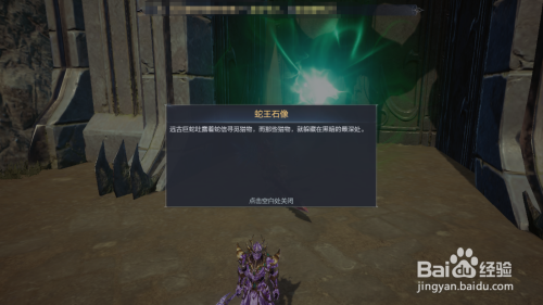 蛇王雕像,到达这里后点击这个绿色的圈。弹出对话框就完成了。
