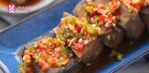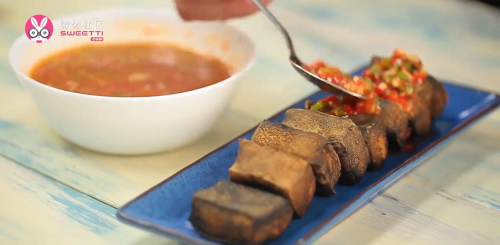 15将臭豆腐摆入盘中,淋季粒上调好的料汁即可。