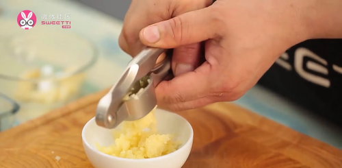 3大蒜用压蒜器压成蒜阅态叮末。