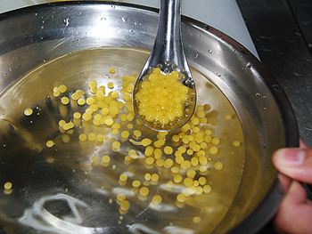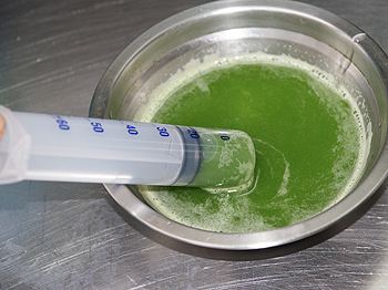 4以针筒将步骤3的黄瓜汁一颗颗滴入步骤2的钙盐水中。
