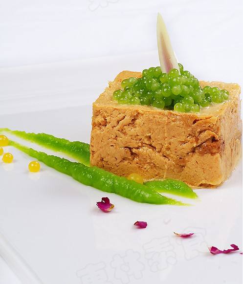 5取盘,放入步骤3的青豆泥,放入步骤4的方形素鹅肝酱,顶部放入黄瓜汁鱼子酱,旁边用橙汁鱼子酱和干玫瑰花瓣点缀,配上步骤2的面包片即可