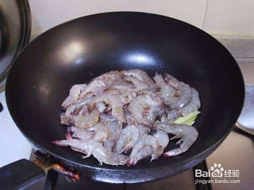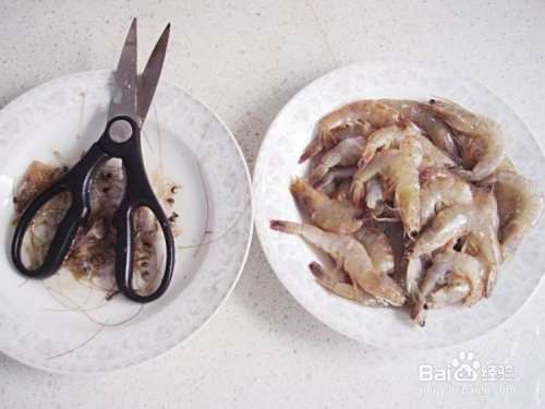 白对虾从后背剪开,挑去沙线,剪去虾芒,漂净