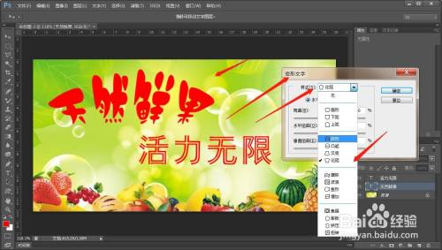 现在打开变形的对话框,这里就有很多系统自带的文字变形方式,尝试改变一下吧