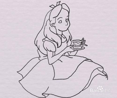第三步,画出Alice纤细的手臂和手指,手捧着英式茶杯(她正在享受下午茶)
