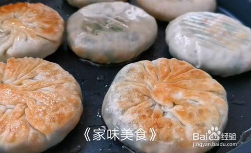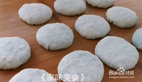 把刚才做好的馅放进饺子皮中包起来,口朝下,再轻轻拍一下,拍成小饼的形状,饼就做好了,先放一旁备用。