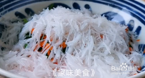 菠菜放凉后挤干水分,再把它切成小段,不用切的太碎,切好之后装入大一点的碗中备用。然后再准备办个去皮的胡萝卜,先切成薄片,然后再切成粗丝放进碗中,在准备之前做好的粉条切成粉段也放入碗中,最后准备几根小葱切成葱花放入碗中,