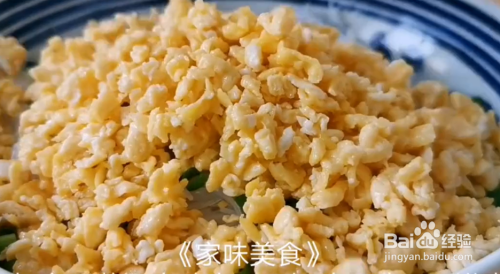再准备一个碗打入三颗鸡蛋。然后用筷子把蛋打散,锅中放油,等油微微热时倒入鸡蛋液,用筷子快速搅拌成鸡蛋碎。