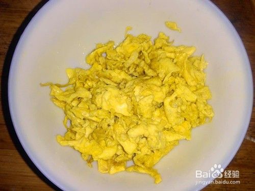 接着锅里放入底油烧热,把搅好的蛋液炒熟打散。盛出备用。