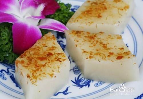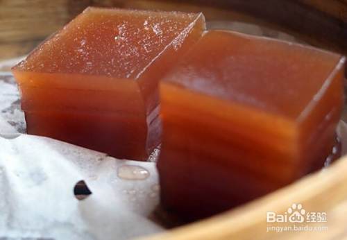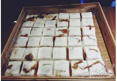 将白糖用热水溶化,放入糯米粉中调制成糊状,倒入涂过油的盘内,上笼蒸熟,冷却后撒上白糖、桂花,切成菱形小块即成,色泽玉白,香甜糯滑。