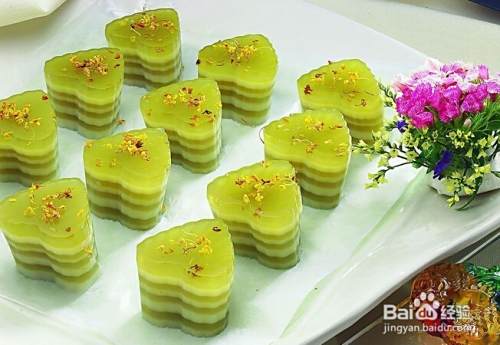 南京的绿豆糕始于清朝,以绿豆粉、糯米粉、白糖、植物油柔糅合成糕粉,馅料为玫瑰豆沙,上笼蒸熟即成。推荐元祖和维利康。