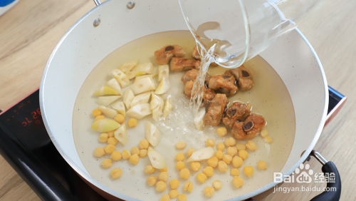 再加入笋、鹰嘴豆和600毫升清水,盖上盖子。 最好一次性加足够量的水,熬出来的汤会更加浓郁可口。