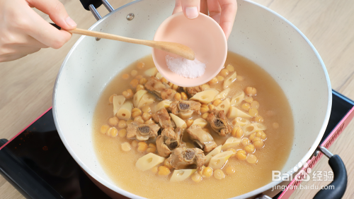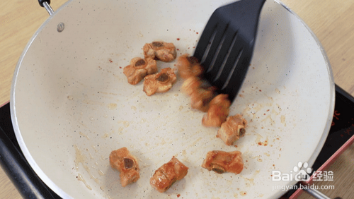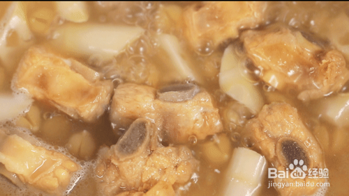 开中火热油后将排骨放入平底锅中,加入生抽,翻炒3分钟。 »翻炒排骨能减少部分油脂,熬制的汤更加入味。