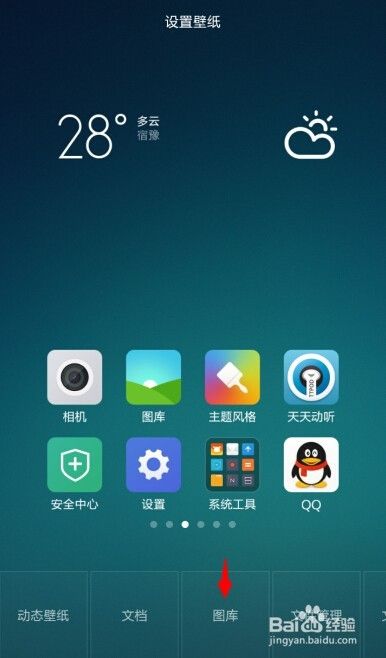 进入‘其他’界面以后,我们可以看到‘动态壁纸’、文档、图库、文件管理选项。动态壁纸里面是自带的壁纸,我们可以通过图库和文件管理来添加我们喜欢的壁纸。在这里我点击‘图库’按钮,如下图: