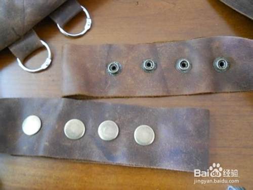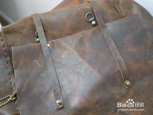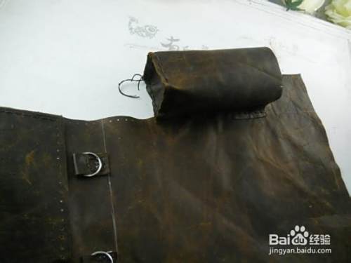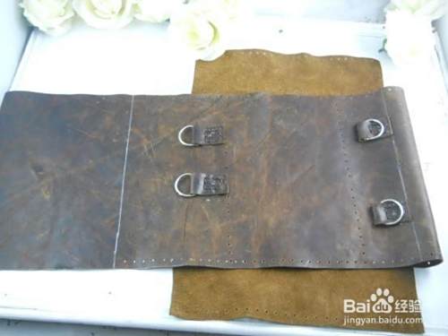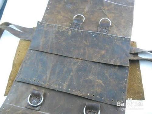 用铆钉在包的背面固定好皮条(侧面的包准备放杯子,皮条来固定杯子)。