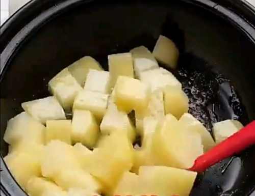 2土豆去皮切块,备瓦煲,热花生油,炒热土豆块,然后放入腌制好的排骨连料汁一起,倒入一大碗水,400ml左右,大火烧开后,控制火候小火炖20分钟即可