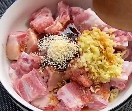 1排骨切3cm长的小块,放入料酒,蚝油,生抽,姜沫,蒜沫,鸡精,适量食盐,搅拌均匀腌制20分钟。