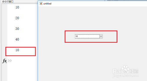 第六步运行m文件之后,选中下拉列表哪一个值,命令行窗口就会打印出这个值,这里是调用了下拉列表的回调函数,如下图所示: