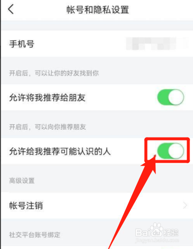 第四步:点击”允许给我推荐可能认识的人”后方的开关即可,如下图所示
