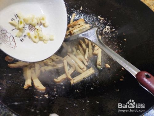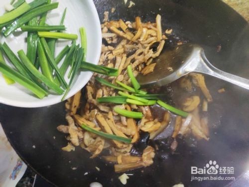 起锅热油,下入姜丝和腌制好的肉丝,翻炒至肉熟透,捞出待用。