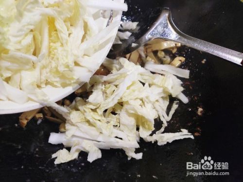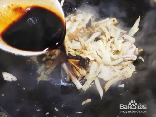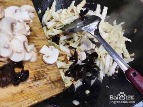倒入黑木耳和蘑菇,继续翻炒一下。