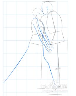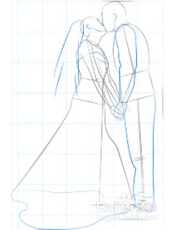 绘制新娘的礼服、面纱和面部特征。(用手)连接新郎的腿和手臂。