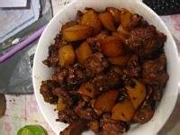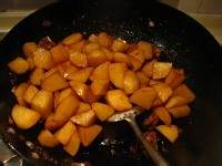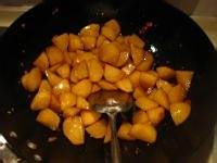 油锅烧热,加入少量的蒜和辣椒,将土豆加入适量的酱油炒至金黄色,盛起备用。
