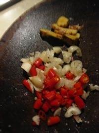 油锅烧热后,加入姜、蒜、辣椒,炒1分钟左右炒出香味。