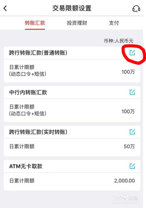 在转帐汇款项下有跨行转帐普通转帐与实时转帐,行内转帐,无卡取款四项限额,这里以第一项跨行转帐普通转帐这一项为例