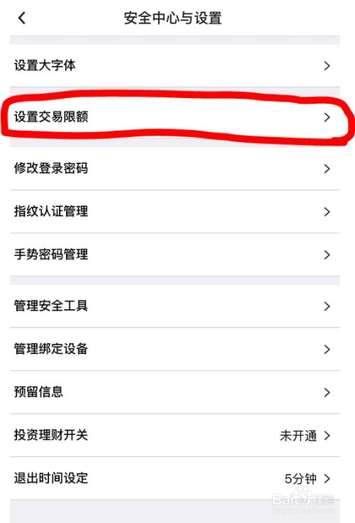 在安全中心界面找到并点击设置交易限额进入设置交易限额界面