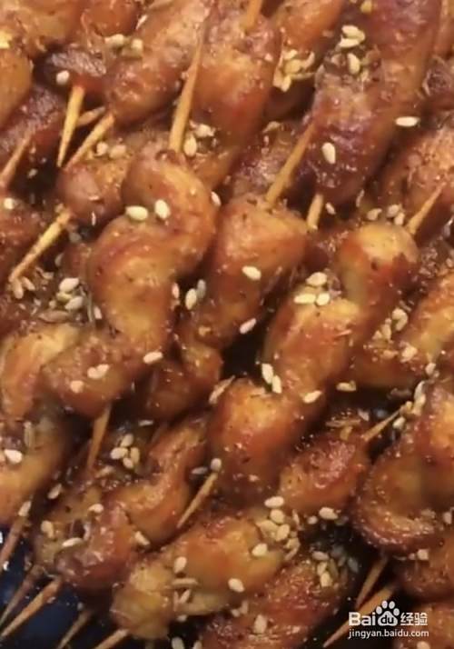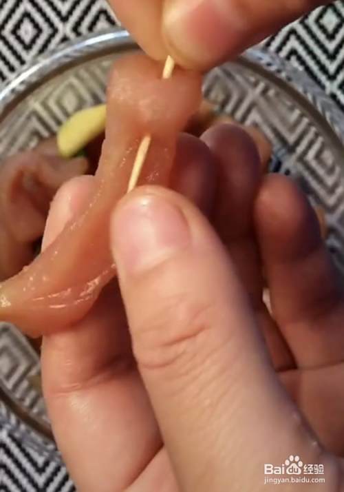 腌制完成后,用牙签将肉一个个的穿好备用。