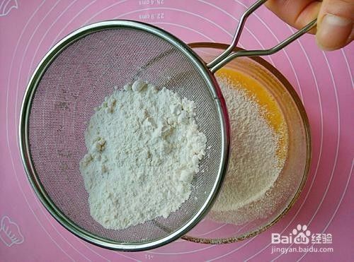4.把糯米粉用筛子筛入鸡蛋碗里。