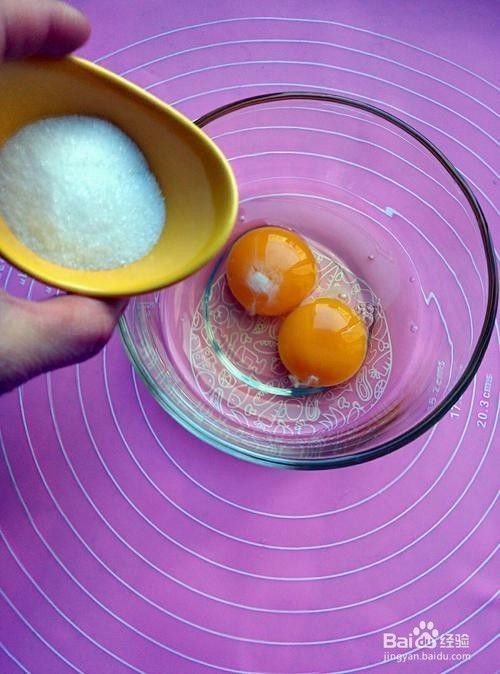 2.将鸡蛋打进碗里,放入白沙糖。