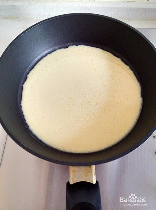 12.不粘锅预热一下,不要放油,倒进三分之一面糊晃动摊满,小火慢慢烙。
