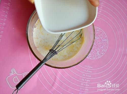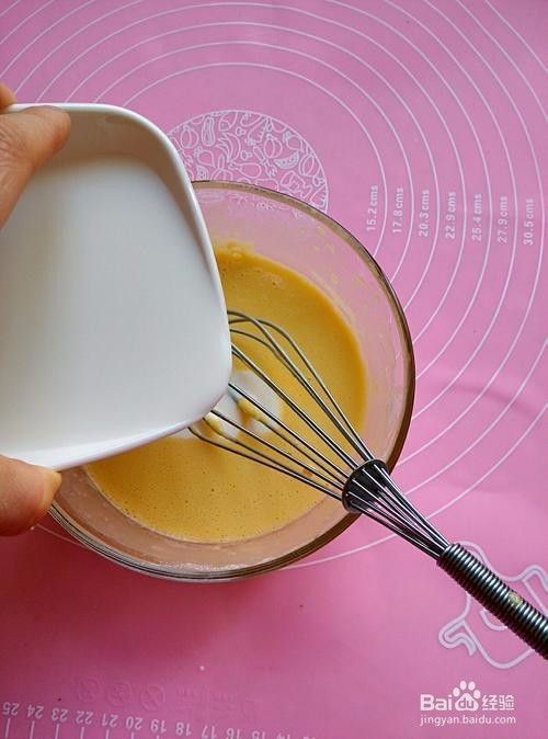 6.牛奶一点一点加入,边加入,边搅拌均匀。