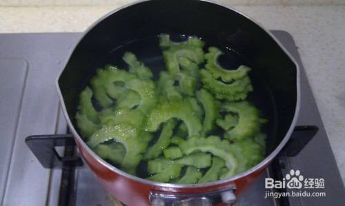 3、坐一锅开水,往锅里加适量的盐,这样能去掉苦瓜的大部分苦味,还能让苦瓜变的翠绿,苦瓜一下锅,心理默数45秒,期间要翻动下苦瓜,然后捞出,放入凉水里,如果有冰水就更好了。