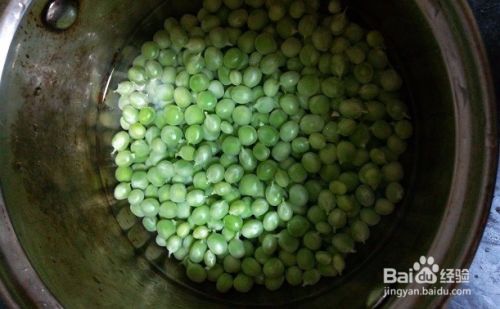 先将豌豆米从豆荚中剥离出来,淘洗后放在汤锅里煮熟。