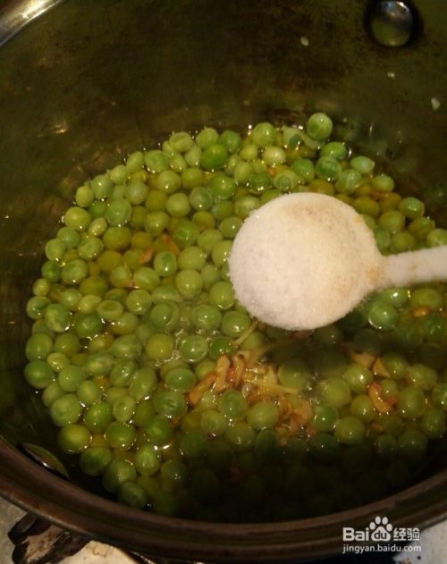 再根据豌豆和汤的量,放入适量的食盐,用锅铲搅拌均匀。