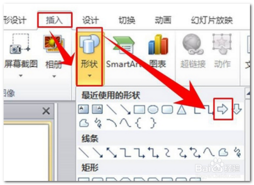 新建并打开一个PPT,在PPT的菜单栏中选择【插入】,然后再在下方点击【形状】,在形状的列表中选择一个基本的箭头符号。