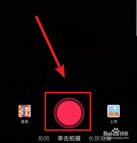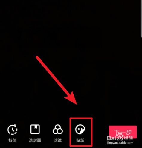 长按拍摄按钮,录制纯黑色背景的视频,这样便于突出我们的特效主体。录制结束后,我们选择页面中的贴纸的图标。