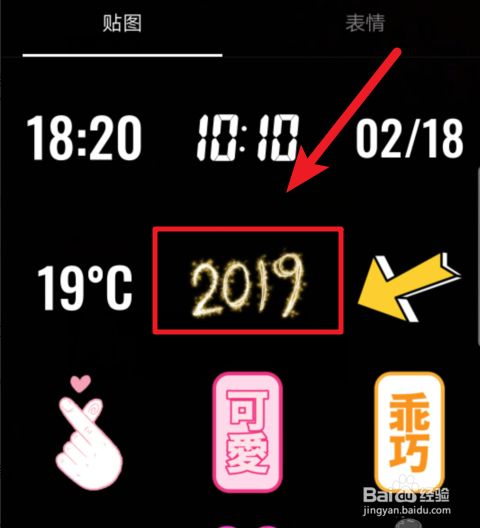 点击后,在页面中就可以看到2019和比心的贴纸,我们首先点击2019这个贴纸图标,如下图所示。