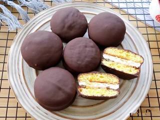 蛋清、柠檬汁和白糖混合,打发,加入蛋黄,搅拌均匀,加入低筋面粉,搅拌均匀,挤入烤盘,放入烤箱中烘烤,取出,放凉,放上棉花糖,继续烘烤,取出,盖上另一片蛋糕,裹上巧克力酱。