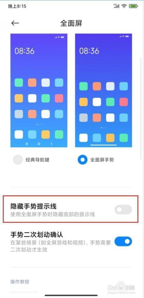 找到隐藏手势提示线选项,将其切换到开关的状态。