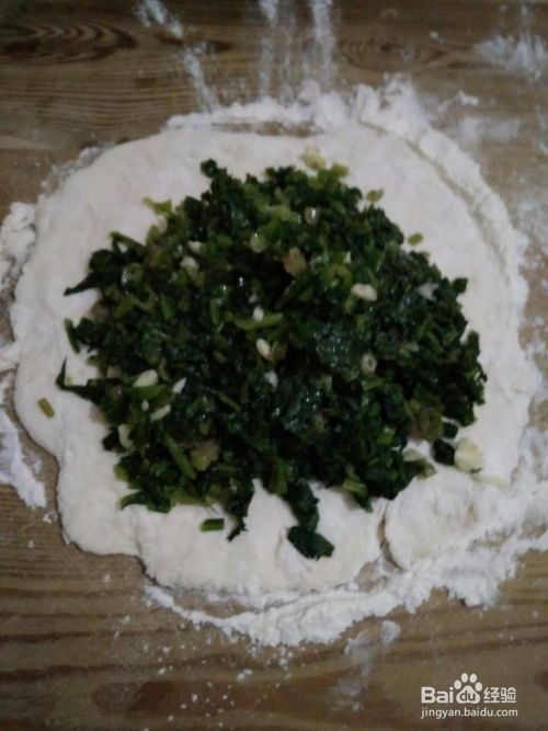 将面粉兑水,醒面,做成面团,压成扁扁的,再将菠菜放入