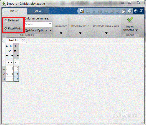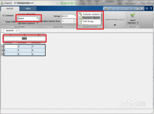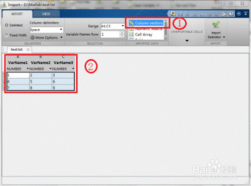 此时对话框变为如图所示,可以在1方框中选择数据的间隔方式,间隔方式以数据文件为准,本例中的数据间隔方式是空格;在2方框中选择需要导出的数据,如列数据、整个矩阵等方式。在这里我们选择导出整个矩阵;然后在3方框中更改变量名即可。