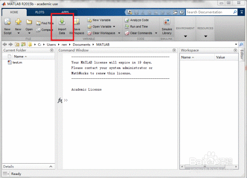 首先介绍手动导入法。该方法适合于利用matlab进行简单的数据处理,而不需要进行编程进行自动化或大规模运算。启动matlab后,在“Home”菜单栏下找到“Import data”选项。