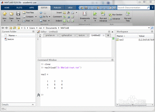 这一步骤介绍程序导入法。相对来说更加方便。命令行业很简单,如本例中为“var2=load('D:\Matlab\text.txt')”,即可将文件中的数据矩阵赋值给数组var2。将该方法用于编程中就可以进行自动导入数据啦。